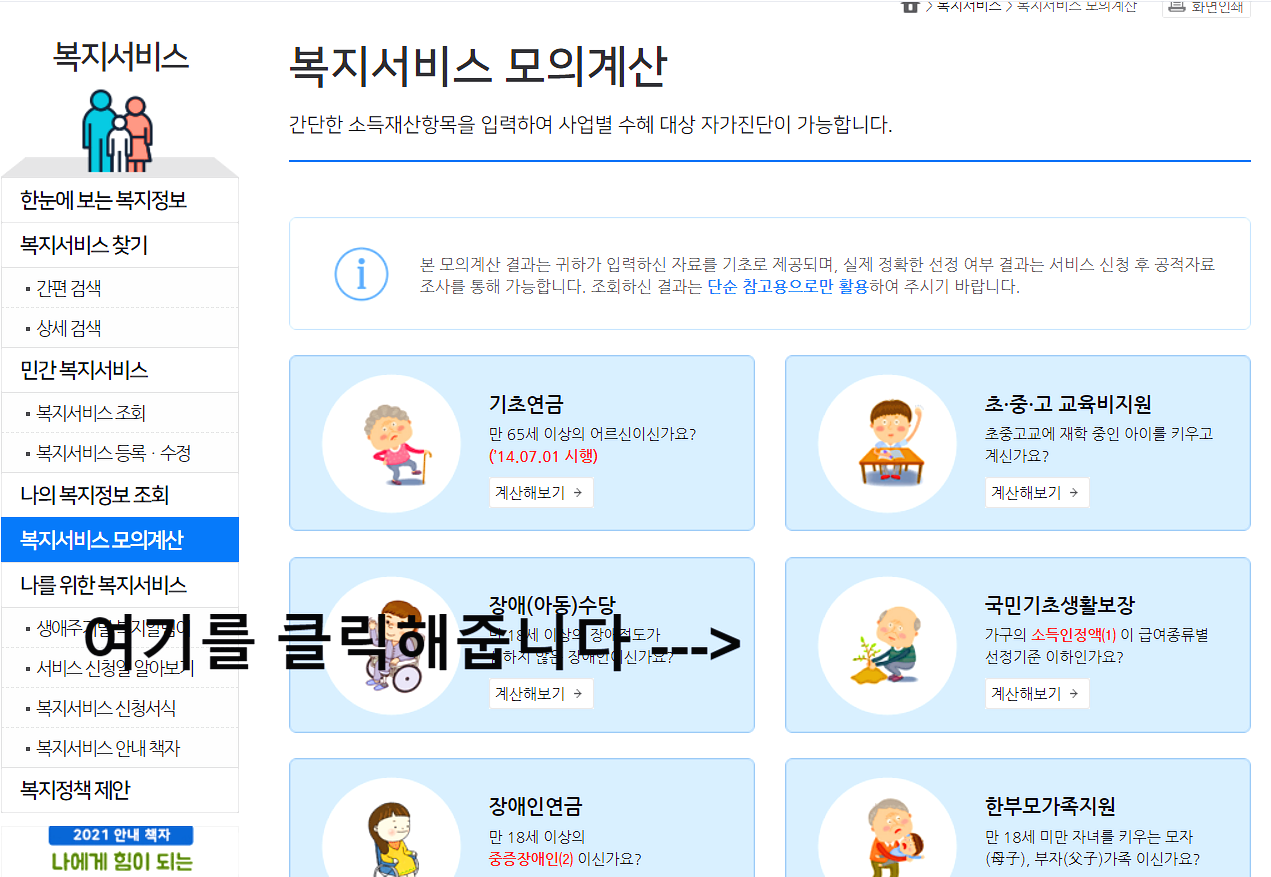 복지서비스 모의계산에서 다양한 조건으로 모의 계산이 가능합니다