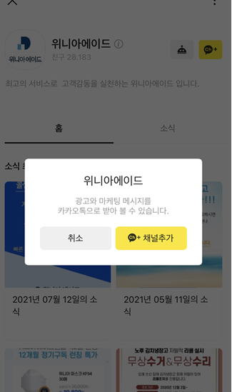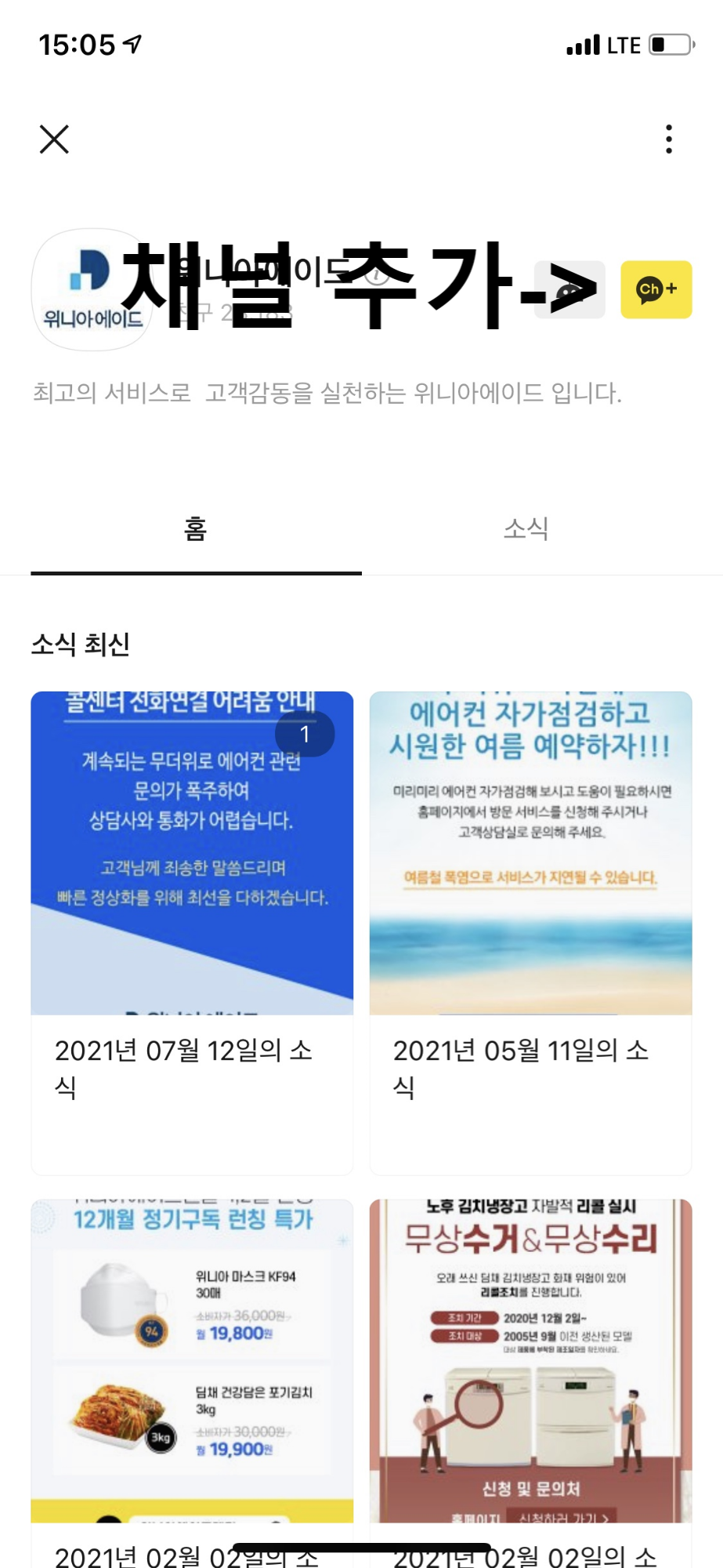 2. 그 뒤에 위니아 에이드를 검색 후 채널 추가를 해줍니다.