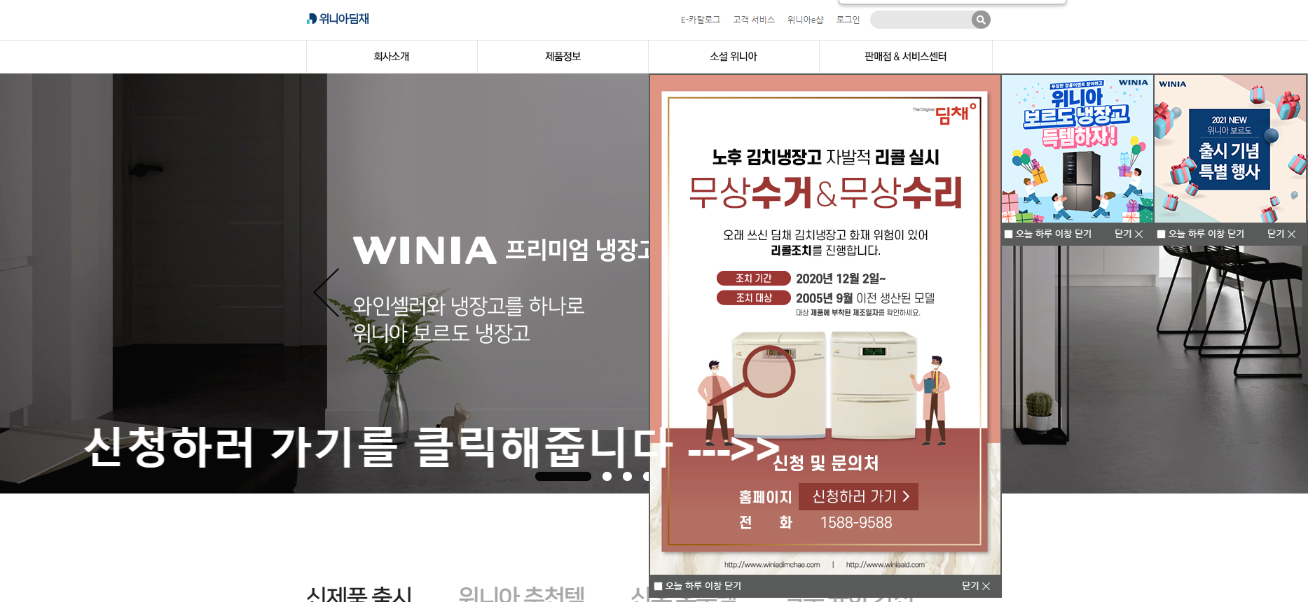 일단 위니아 딤채 사이트에 접속하시면 메인 페이지에 이러한 창이 뜨는데요.