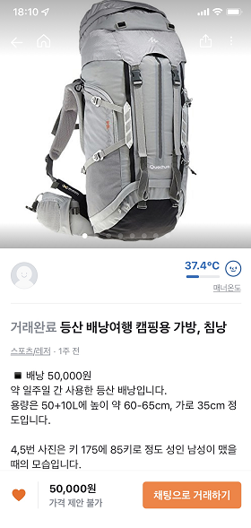 그래서 당근 마켓을 뒤져보니 저희 집에서 약 7km 떨어진 곳에서 아래와 같이 50+10L 가방을 팔고 있더라구요