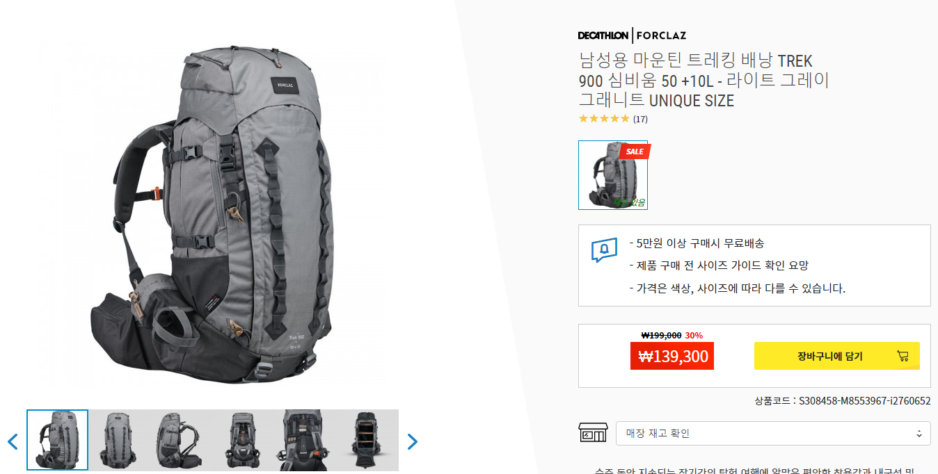 오스프리, 킬리사의 가방들이 50~60L면 대략 30만원대에 이르는데 데카트론 가방은 14만원입니다