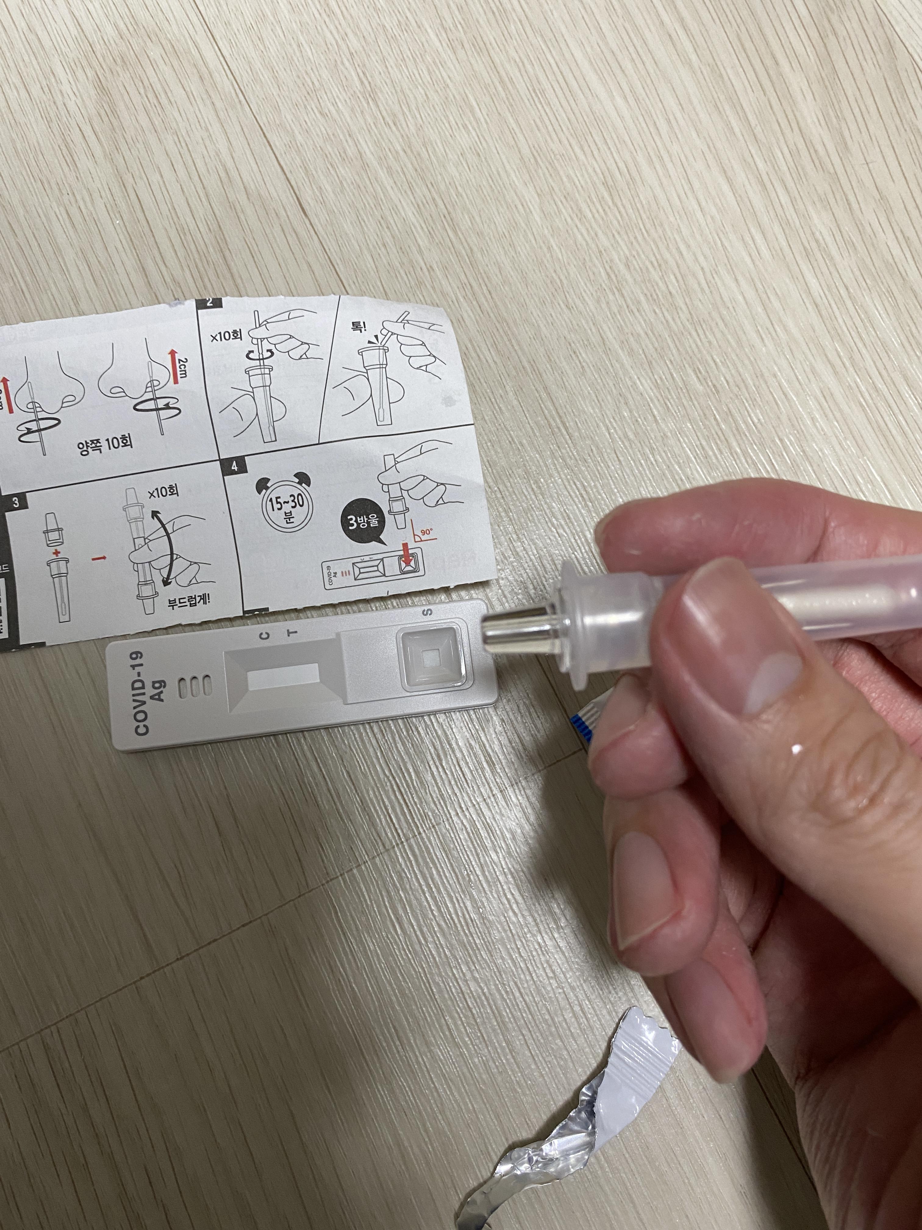 통에 액체가 들어가있는데 그 액체가 면봉에 묻은 제 코 속 성분이랑 합쳐져서 코로나 검사가 되는 듯 합니다.