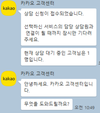 카카오 고객센터에 상담원 분에게 문의를 하는 방법인데, 이 방법을 요즘 많이들 사용하고 계신다고 합니다.
