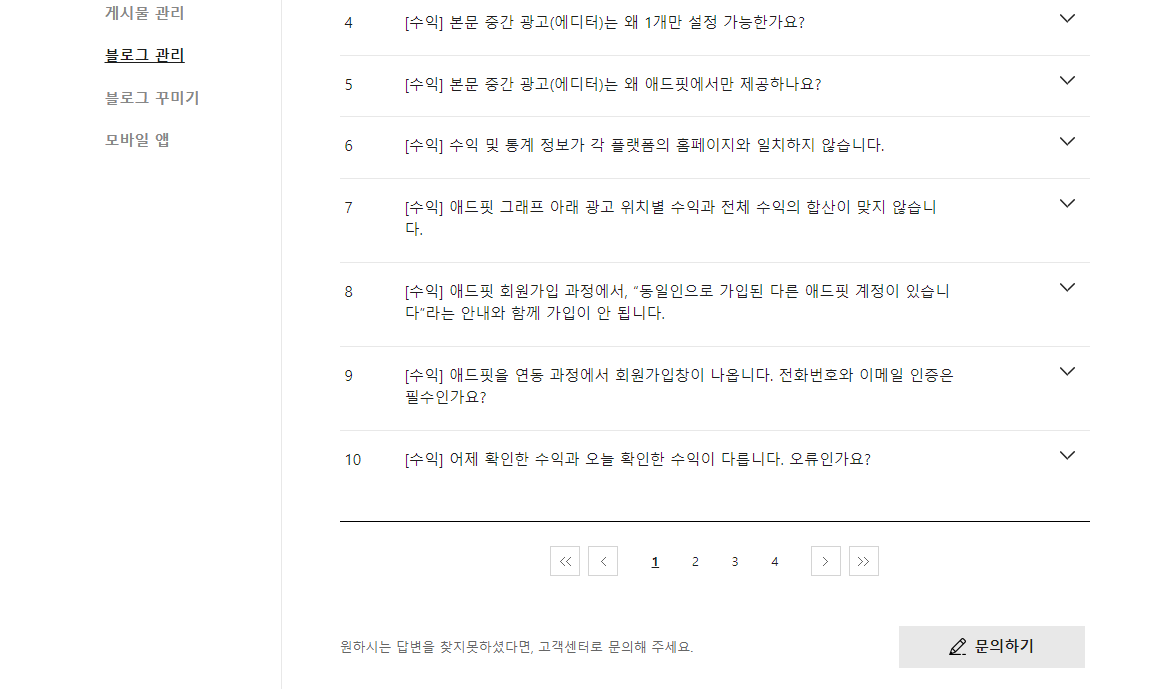 그리고 블로그 관리로 들어가신 다음에 가장 아래쪽에 보시면 문의하기가 있습니다.