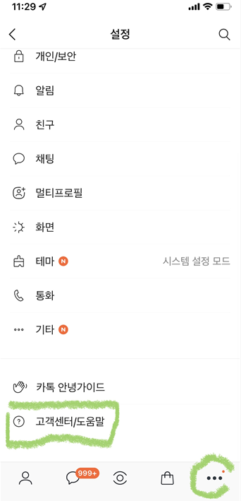 모바일 카카오톡으로 가장 아래 점 3개를 누르고 고객센터를 눌러줍니다