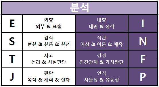 N : 무언가 일을 처리할 때 예상하고 예측을 잘하며 직관적으로 상황을 주시함