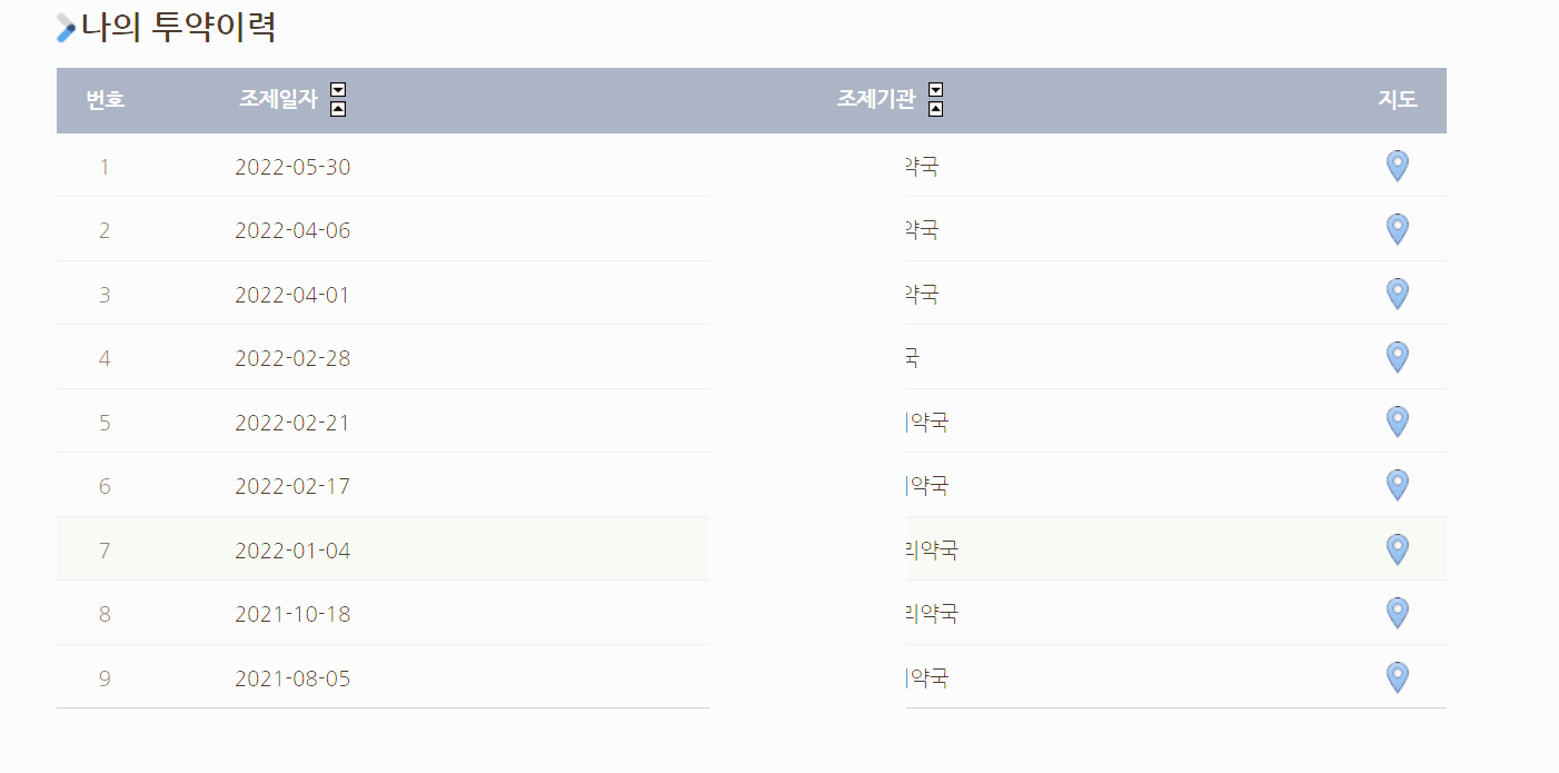 아무튼 핸드폰으로도 또 이중으로 인증을 하고 나면 아래와 같이 내가 어디 약국에서, 몇일에 처방을 받고 무슨 약을 타갔는지 확인이 됩니다