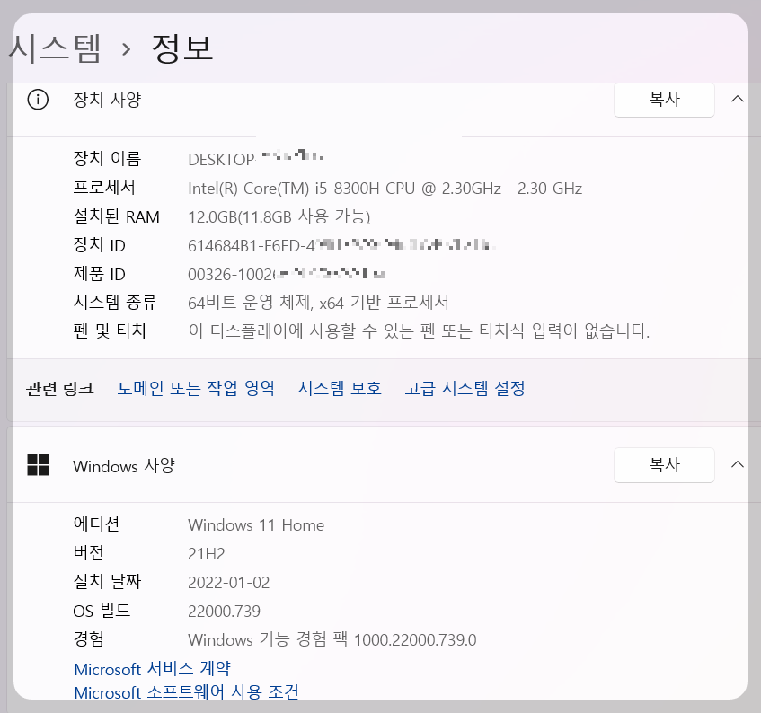 그러면 아래와 같이 내 컴퓨터의 사양을 바로 확인할 수 있습니다.