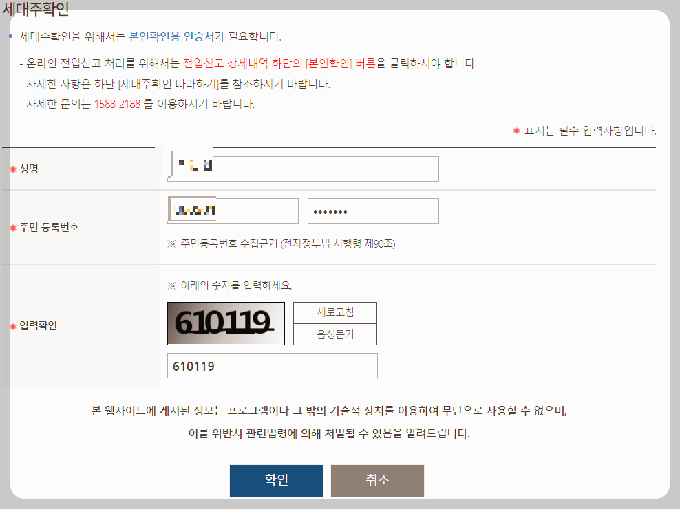 (제 기준으로는 저의 누나가 현재 세대주이기 때문에 누나의 정보를 입력하면 되겠습니다.)