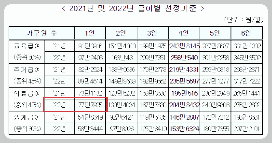 2022년 기준으로 중위 소득 40%의 경우 77만 7925원