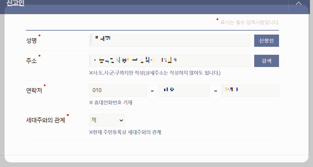 (저의 경우 제가 세대 분리를 원해서 제 이름과 주소, 전화번호를 넣었습니다.)