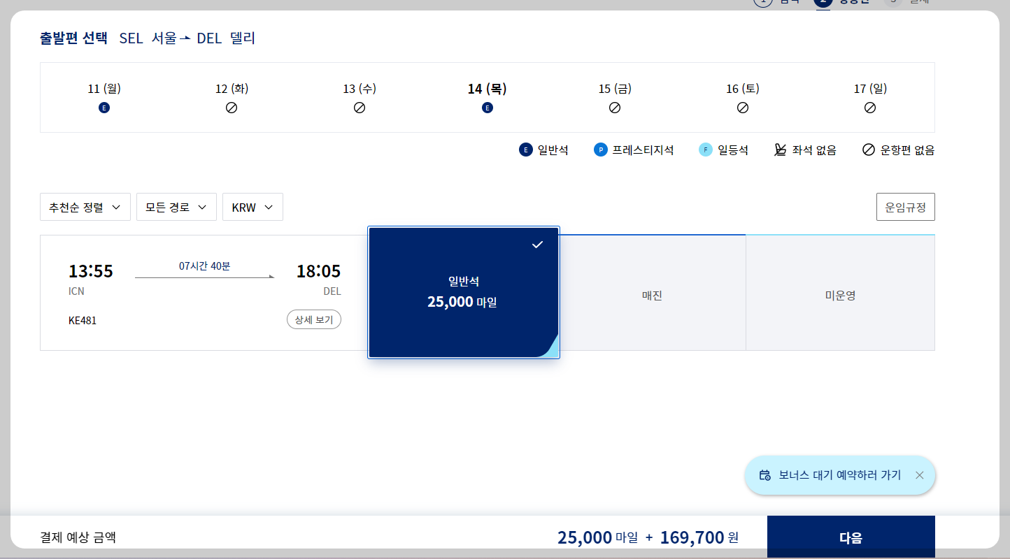 예시를 들자면 7/14 델리에 가는 비행기의 경우 마일리지로 구매할 경우 아래와 같이 25,000마일 + 169,700원입니다