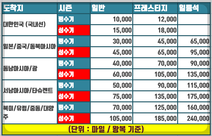 또 성수기와 비수기로 나눠져서 마일리지 비용 또한 달라지는데요