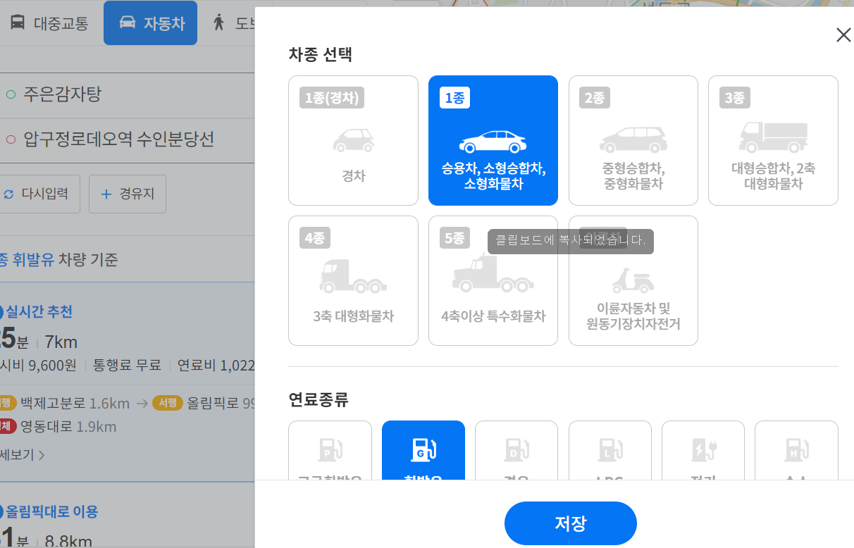 파란색 길찾기 버튼 아래를 보시면 차종/연료 설정이 보이는데요