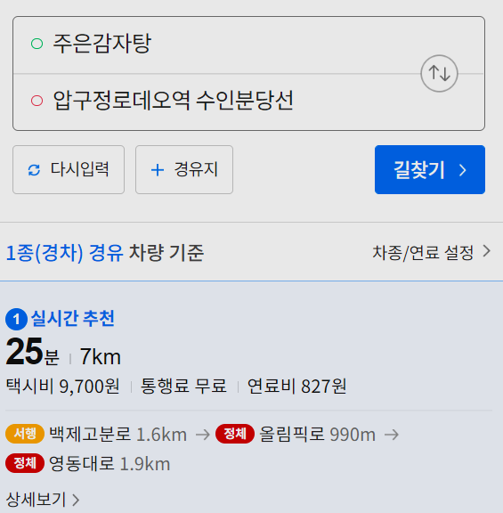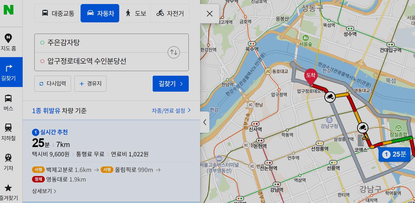 (유독 퇴근 시간이나 주말에는 길이 막히는 경우에 다른 길로 돌아서 가게끔 안내를 해주는 경우가 있었습니다. 그런 경우에 생각보다 이동 거리가 더 많이 늘어날 수 있기 때문에 어느정도 체크를 해주시는게 중요합니다)