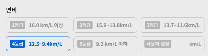 (1등급 16km/리터당 & 2등급 15.9 ~ 13.,8km/리터당 등등)