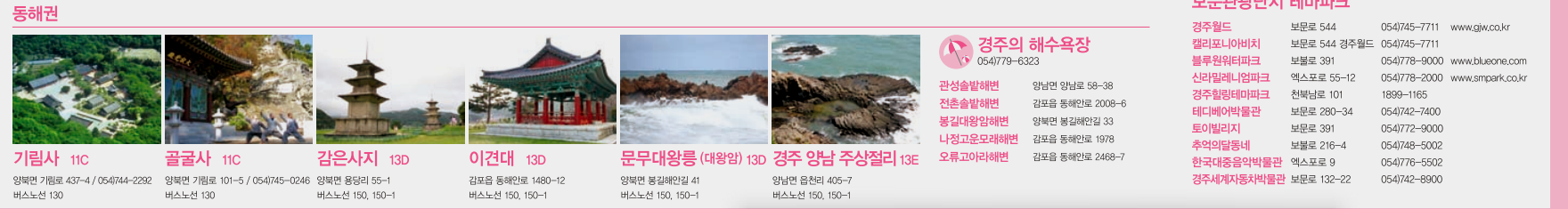 경주 하이코, 경주동궁원, 경주세계문화엑스포공원, 기림사, 골굴사, 감은사지, 이견대 등의 다양한 석탑과 사원들이 있습니다.
