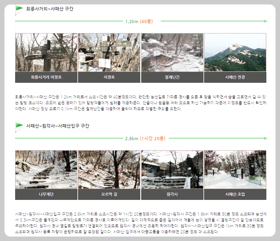 약간의 높은 경사가 있으며 돌계단이 많기 때문에 아주 어린 아이들이 가기에는 힘들 수 있기 때문에 아이들을 데리고 등반하는 경우엔 사패산 혹은 원각사까지만 등산한 뒤에 하산하는 것이 좋다고 합니다