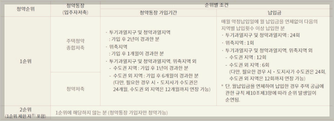 위에 기준을 채워야 청약 통장 1순위가 될 자격이 주어집니다