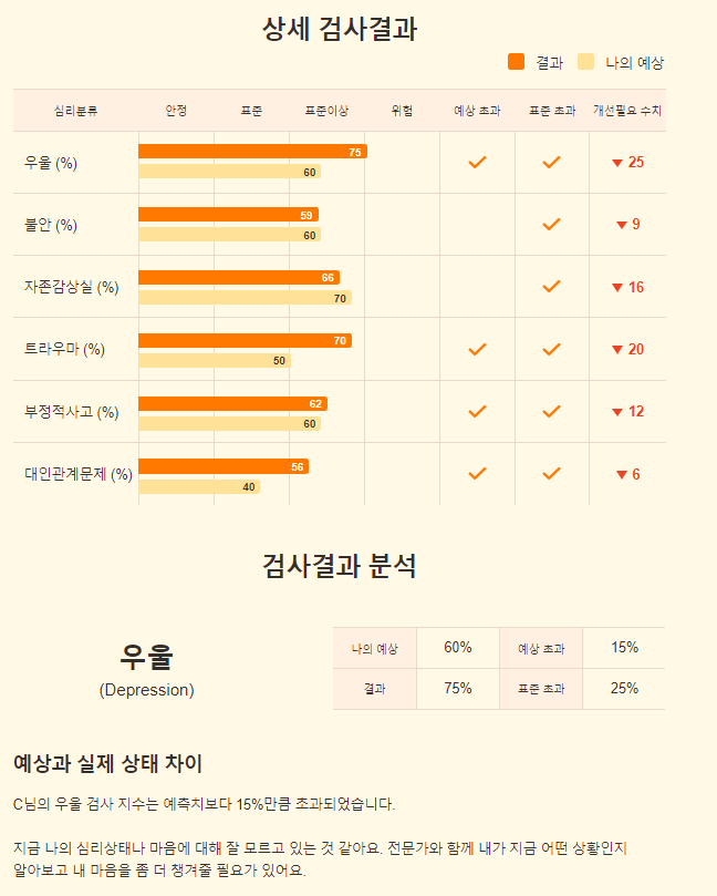 사실 우울한 감정이 좀 높다고 생각했었는데, 검사 결과에서도 여지없이 나온 것 같습니다